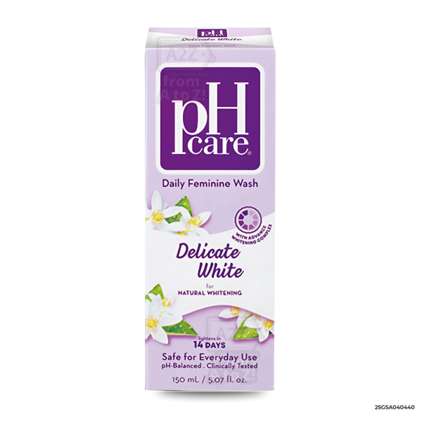 pH Care Delicate White Feminine Wash 150 mL is a gentle intimate cleanser with an Advance Whitening Complex to help lighten the bikini area in 14 days. It is pH-balanced (5), hypoallergenic, and paraben-free for safe daily use.